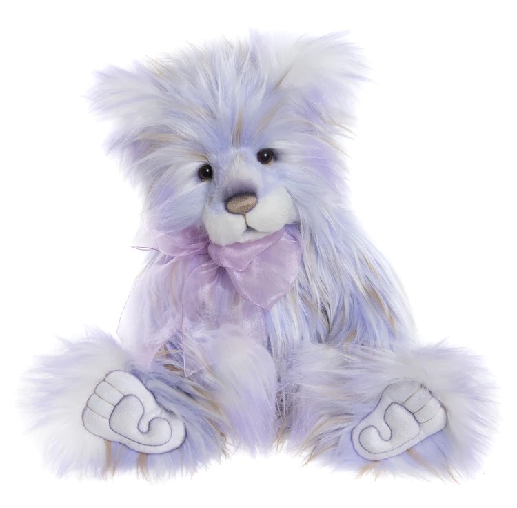 She has a beautiful, curious face and looks like she’s quietly listening to everything going on. Her long fur is a mix of white and purple with touches of browny/gold.